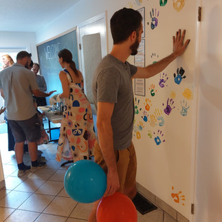 These promises form the core of our community, and to symbolize our commitment to these promises, each family was invited, one by one, to cross the threshold, paint their palms, and make their mark on our wall.