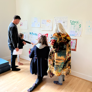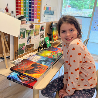 Hero‑Led Tour & Showcasing Favourite Work After the discussion, each hero became a tour guide. Families walked through the studio spaces with their child, listening to their explanations of materials, observing them in their work flow, and getting to see what the learner was proudest of. Perhaps it was a self authored and illustrated story, a collection of books read over the session, an art piece, or their Hero Board (a poster of their making, with words and pictures to describe them, their interests, their heroes, and what they hold most dear). Whatever it was, it was chosen by them. The hero paused, shared the story behind the work, answered questions, and invited parents into their thinking.